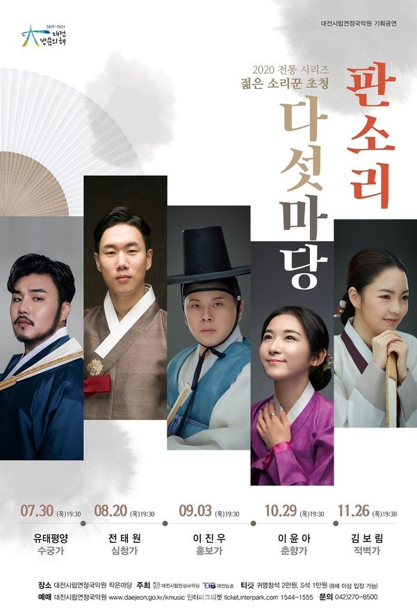 대전시립연정국악원(이하 국악원)과 TJB대전방송이 2020전통시리즈 ‘젊은 소리꾼 초청, 판소리 다섯 마당’을 공동주최로 무대에 올린다.