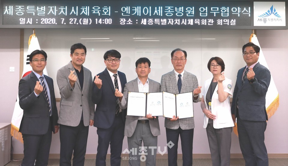 세종특별자치시체육회(회장 정태봉)와 엔케이세종병원이 27일 시 체육회관 회의실에서 업무협약을 맺고 세종특별자치시 체육 및 의료발전을 위해 서로 협력해 나가기로 뜻을 모았다.