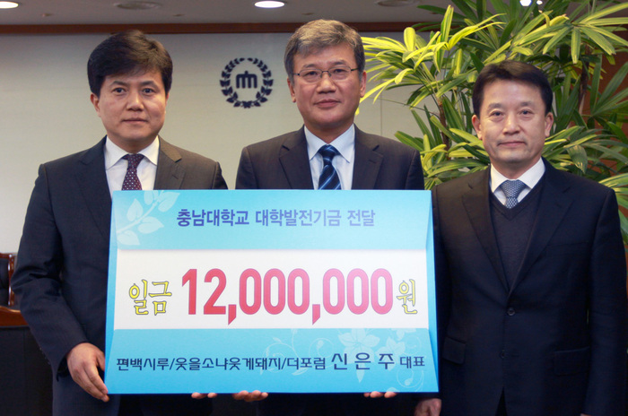 충남대 정문 앞 편백시루, 웃을 소냐 웃게 돼지, 더 포럼 등을 운영 중인 신은주 대표를 대신해 박상덕 이사는 1월 22일(수) 오후 4시, 정상철 총장을 방문해 대학발전기금으로 1200만원을 약정했다.