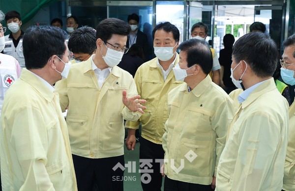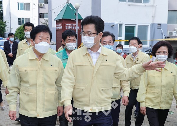 박병석 국회의장은 31일 오전 허태정 대전시장과 전날 폭우로 피해를 입은 대전 서구 정림동 코스모스아파트와 우성아파트 현장, 이재민 임시대피소(오량실내체육관)를 찾아 피해 주민들을 위로하고 신속한 피해복구 지원을 약속했다.