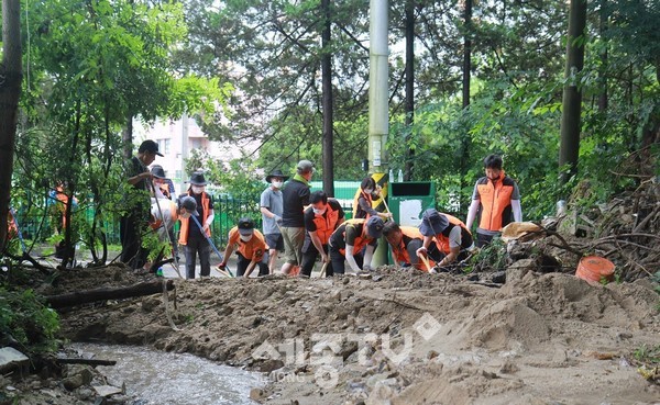 이날 둔산소방서 소속 소방공무원과 의용소방대로 구성된 긴급복구반 50여명은 갈마동 인근 산에서 아파트 쪽으로 흘러내린 토사를 제거하고 막힌 배수로를 뚫으며 구슬땀을 흘렸다.