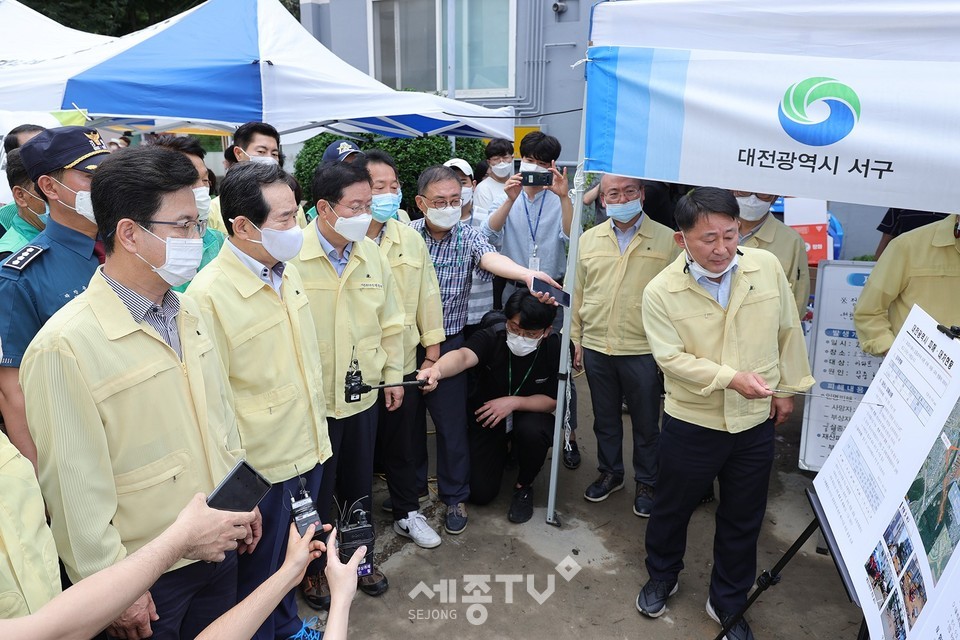 정세균 국무총리는 1일 오전 허태정 대전시장, 김계조 행정안전부 재난안전관리본부장과 집중호우로 피해를 입은 대전 서구 정림동 코스모스아파트 복구현장을 찾아 피해 주민들을 위로하고 피해 신속한 피해복구와 추가 피해 예방, 재발 방지를 위한 대책 마련 등을 지시했다.