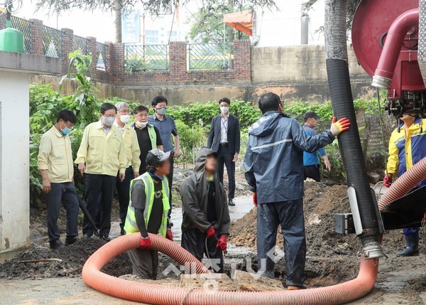 장종태 서구청장이 5일 계속해서 비가 내리는 가운데 피해를 본 정림동 코스모스아파트를 찾아 복구 상황을 점검하고, 복구 작업을 하는 공직자들과 봉사자들을 격려했다.