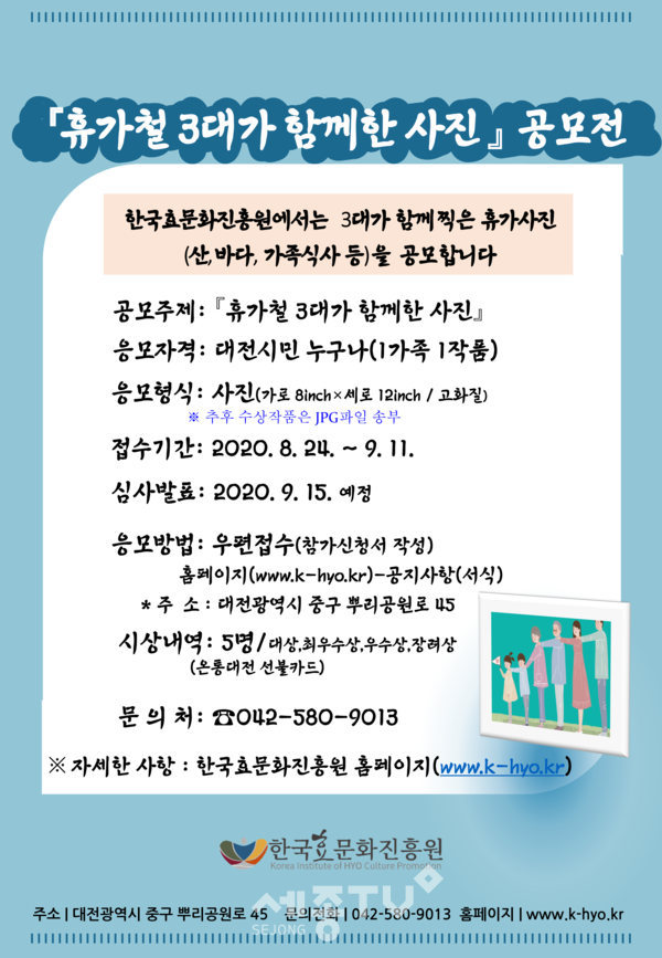 한국효문화진흥원(원장 문용훈)은 가족(3대)들이 여름휴가철을 맞아 휴가지(산, 바다, 계곡, 가족식사 등)에서의 행복한 순간을 사진으로 담아낸 「휴가철 3대가 함께한 사진」공모전을 개최한다. 이번 사진 공모전은 가족의 소중함을 느끼며 효문화 정신을 고취한다는 취지를 담고 있다.