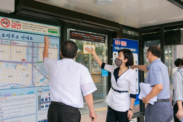정명희 구청장은 지난 4일 구민의 대중교통 버스를 타고 불편사항 등 살펴보고 이어 버스정류장에 설치한 각종 편의시설의 운영 실태를 점검하는 행보에 나섰다.