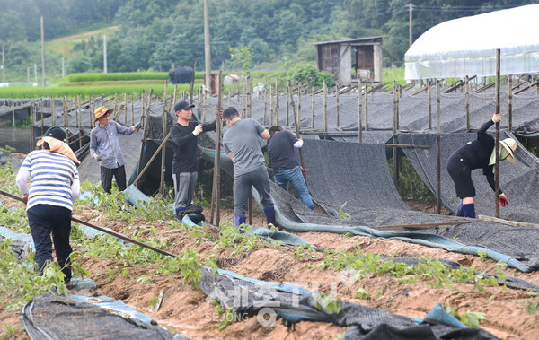 -김명선 의장 비롯한 사무처 직원 등 제원면 인삼밭 복구 작업 총력-