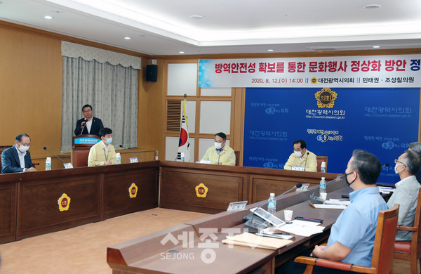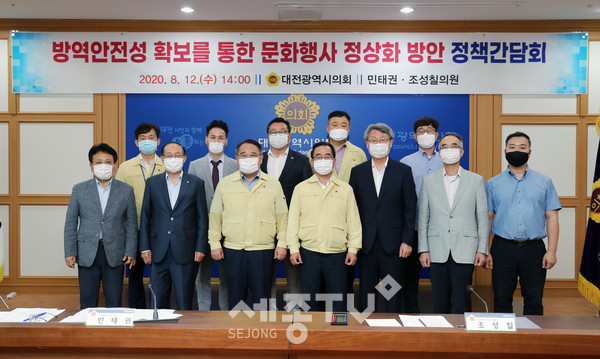 대전광역시의회 민태권 의원(더불어민주당, 유성구1)·조성칠 의원(더불어민주당, 중구1)은 12일(수) 시의회 대회의실에서 ‘방역안전성 확보를 통한 문화행사 정상화 방안’이라는 주제로 정책간담회를 개최했다.