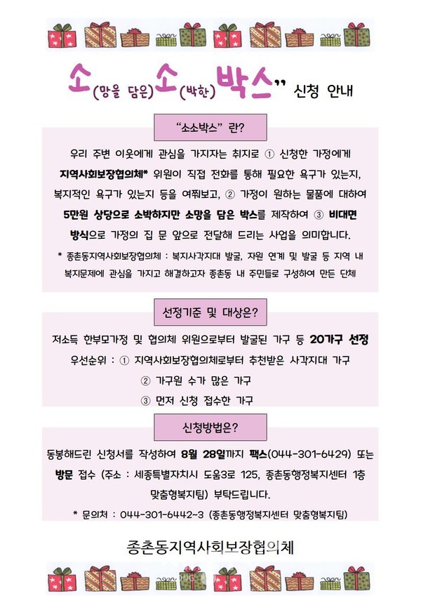 세종특별자치시 종촌동지역사회보장협의체가 하반기 특화사업으로 저소득 한부모 가정의 정서적 지원을 위한 ‘소소박스’ 사업을 추진한다.
