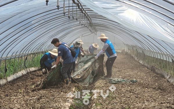 이날 복구 작업에는 조두식 본부장 및 류병관 충남·세종노조위원장을 비롯한 30여명이 동참하였으며 하우스 내 침수된 농작물과 비닐, 농자재를 정리하고 토사가 굳기 전에 신속한 제거작업이 추진되었다.