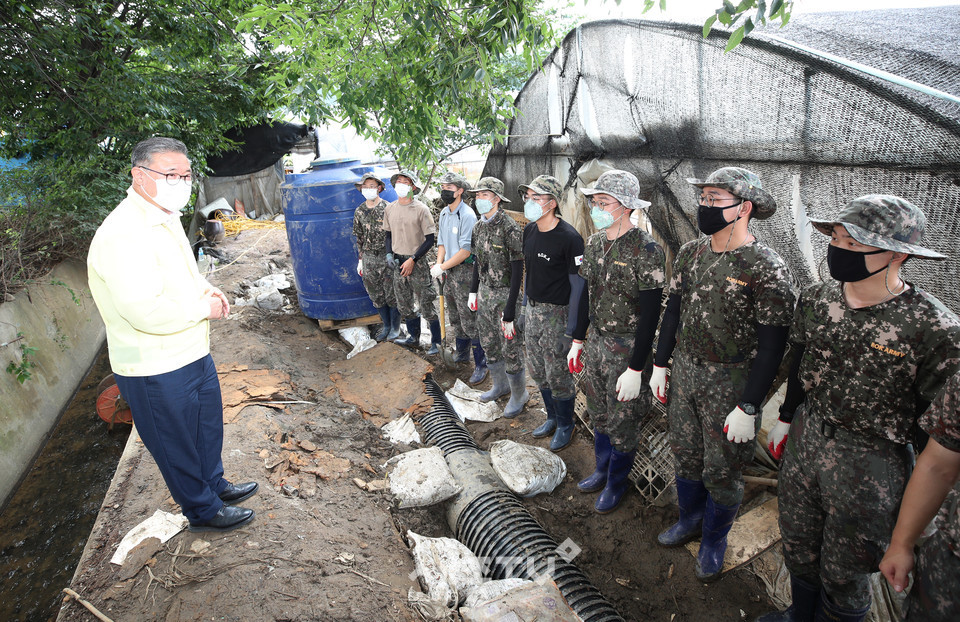 충남도의회 김명선 의장은 14일 집중호우로 큰 피해를 입은 아산시 배방읍 수해 지역을 방문해 시름에 빠진 마을 주민들을 위로하고, 피해복구에 손길을 보태고 있는 자원봉사자와 군인들을 격려했다.