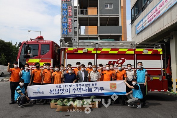 대전시 유성소방서는 14일 오후 2시 유성구 소재 연구개발특구진흥재단이 코로나19 확산방지를 위해 일선 현장에서 헌신하는 소방관들에게 제공해 달라며 수박 25통을 전해왔다고 밝혔다.
