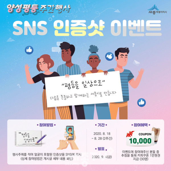세종특별자치시(시장 이춘희)가 오는 9월 첫 주 양성평등주간을 앞두고 양성평등문화 확산 분위기 조성을 위한 사전 행사로 SNS 인증 샷 이벤트를 실시한다.
