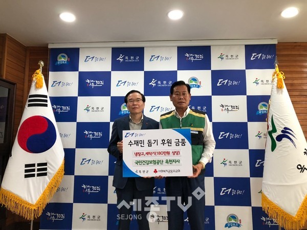 국민건강보험공단 옥천지사(지사장 이태영, 보은‧옥천‧영동군)는 19일 옥천군수 집무실에서 김재종 옥천군수에게 용담댐 방류로 큰 수해피해를 입은 이재민을 돕기 위한 구호물품을 전달했다.