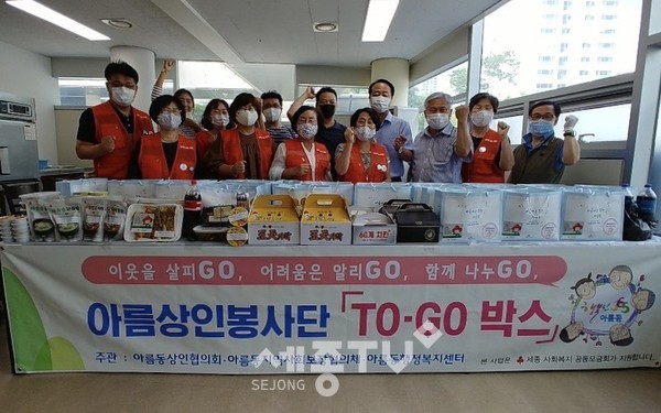 세종특별자치시 아름동지역사회보장협의체(위원장 여상수·오미경)가 아름동상인협의회(회장 함현민)와 협력해 어려운 이웃에게 매월 음식을 제공하는 ‘아름상인봉사단 TO-GO박스’ 지원 사업을 개시했다.