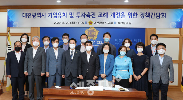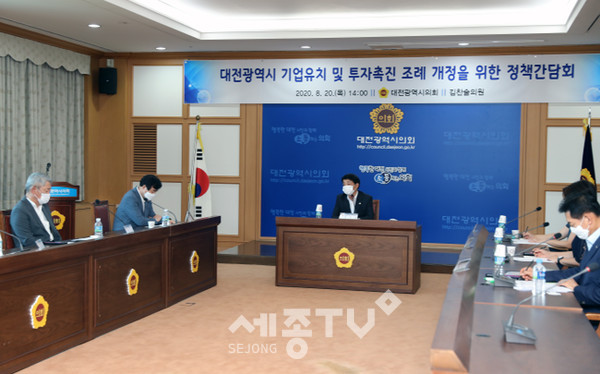 대전광역시의회 김찬술 의원(더불어민주당, 대덕구2)은 20일(목) 시의회 대회의실에서 「대전광역시 기업유치 및 투자촉진 조례」 개정을 위한 정책간담회를 개최했다.