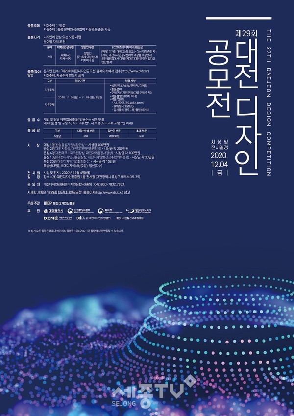 작품 접수는 대전디자인진흥원에서 운영하는 제29회 대전디자인공모전 홈페이지(http://www.didc.kr)를 통해 온라인으로만 진행하고 접수는 11월 2일부터 6일까지 5일간 진행된다.