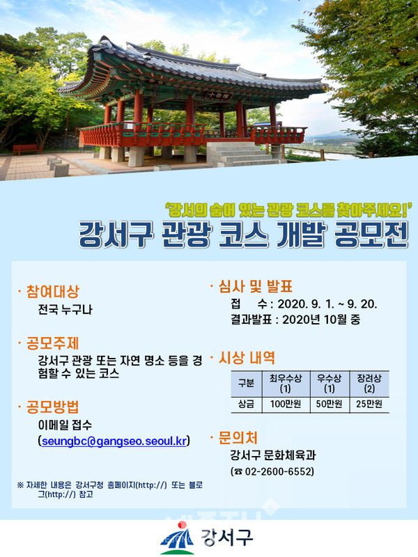 서울 강서구(구청장 노현송)는 구의 숨어 있는 관광 명소들을 찾는 ‘강서구 관광코스 개발 공모전’을 개최한다고 밝혔다.