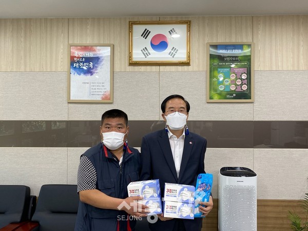 국민건강보험공단 옥천지사(지사장 이태영, 보은.옥천.영동군)에 25일 보은출신 지사장실로 보은에 살고 있는 김민식씨가 옥천군 수해피해복구 봉사활동을 했던 마을에 전해 달라고 마스크 205매를 갖고 방문했다.