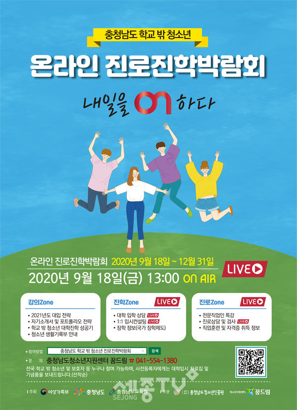 청남도와 충청남도교육청이 주최하고 (재)충청남도청소년진흥원(이하 청소년진흥원)이 주관하는 ‘충청남도 학교 밖 청소년 진로진학박람회’ 가 오는 9월 18일(금) 온라인을 통해 운영될 예정이다.