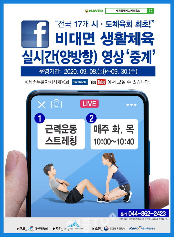 세종특별자치시(시장 이춘희)가 코로나19로 체육활동에 제약이 많은 시민들을 위해 온라인으로 체육 강좌를 제공하는 ‘생활체육 실시간 영상프로그램’을 8일부터 확대·운영한다.