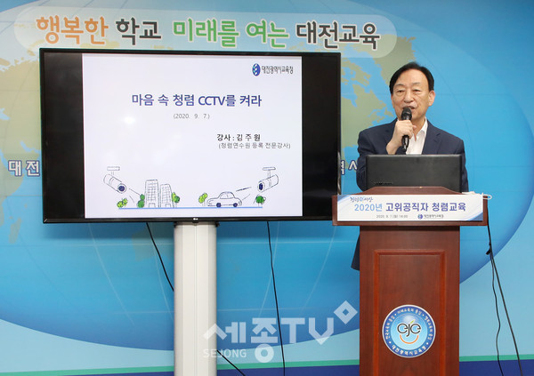 대전광역시교육청(교육감 설동호)은 9월 7일(월) 14:00 교육감 등 소속 고위공직자 80여 명을 대상으로 화상회의 플랫폼 줌(Zoom)을 활용한 쌍방향 온라인 청렴교육을 실시했다.