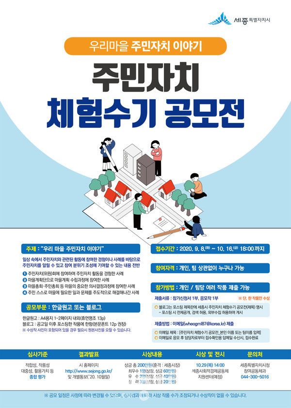 세종특별자치시(시장 이춘희)가 8일부터 내달 16일까지 ‘우리 마을 주민자치 이야기’를 주제로 주민자치 체험수기 공모전을 개최한다.