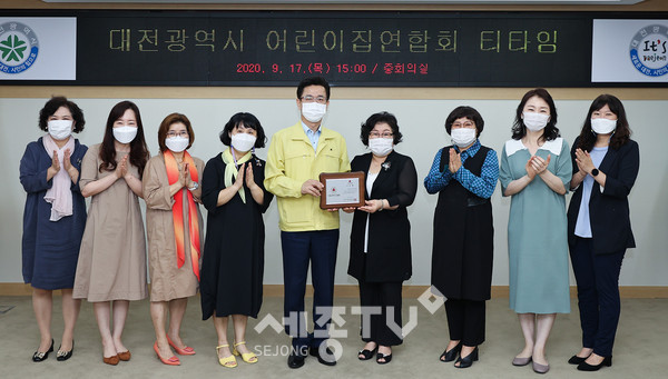 허태정 대전시장은 17일 오후 3시 시청 중회의실에서 대전광역시 어린이집연합회(회장 이애란) 임원 8명과 소통의 시간(티타임)을 갖고 코로나19로 어린이집 휴원 장기화로 인한 긴급보육 등 보육현장의 어려움을 격려했다.