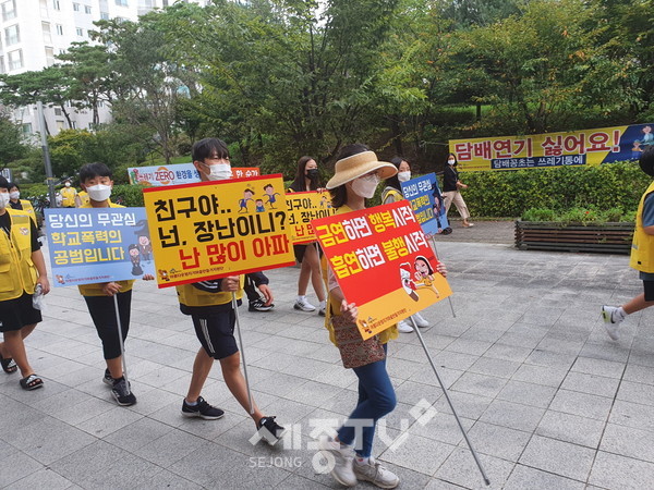 세종특별자치시 아름동행정복지센터 뒷길 금연거리 일원에서 아름다운 범지기마을 만들기 지원단(단장 장석우)이 지난 23일 학생과 함께 학교폭력예방 및 금연 캠페인을 실시했다.