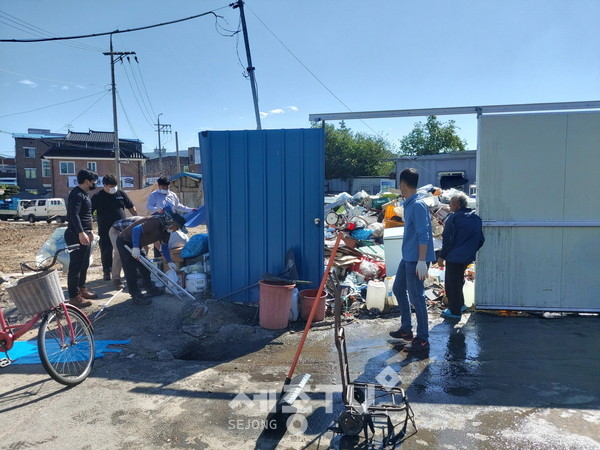 이날 국토대청결 운동이 펼쳐진 전의역 일원은 환경 취약 재활용업체가 십수 년째 도로변까지 고물더미를 쌓아놓아 통행저해, 악취 등의 문제를 발생시키고 있는 곳이다.