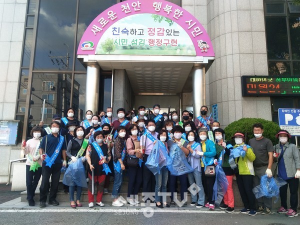 천안시 쌍용1동 통장협의회 등 자생단체와 공무원 60여명이 코로나19 확산방지를 위해 마스크 착용 등 방역수칙을 철저히 준수하며 28일 추석맞이 지역대청소를 대대적으로 실시했다.