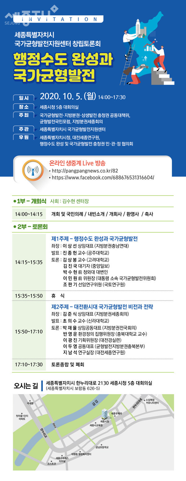 세종특별자치시(시장 이춘희)는 국가균형발전지원센터(센터장 김수현) 창립행사의 일환으로 오는 10월 5일 ‘행정수도 완성 및 국가균형발전’을 주제로 토론회를 개최한다고 밝혔다.
