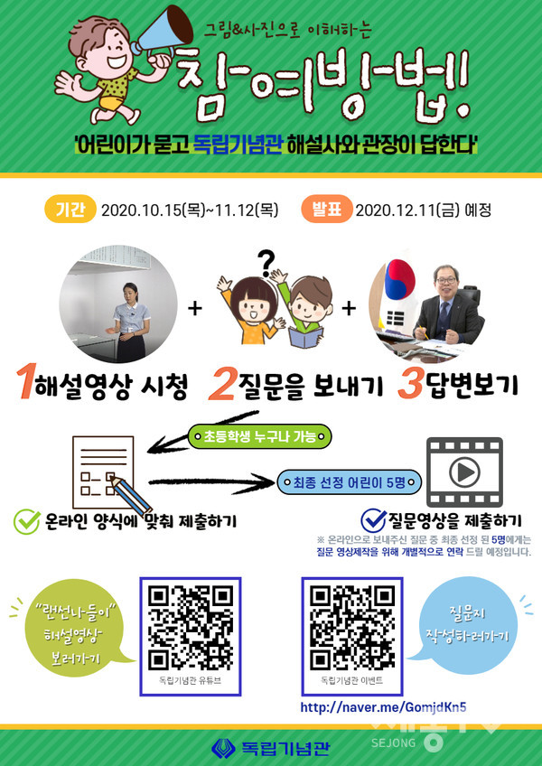 독립기념관(관장 이준식)은 코로나19로 인해 학생들의 현장학습이 어려워짐에 따라 독립운동사 온라인 콘텐츠를 제공하고 ‘어린이가 묻고 독립기념관 해설사와 관장이 답한다’라는 온라인 이벤트를 실시한다고 밝혔다.