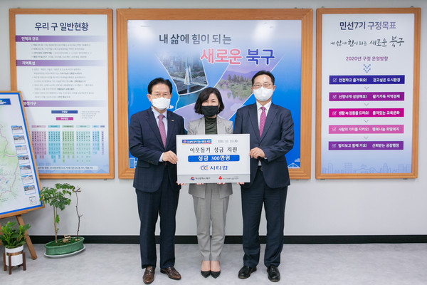 부산 북구 정명희 구청장은 (주)시티캅(대표이사 정현돈)이 지난 13일 북구청을 찾아 이웃돕기 성금 300만원을 기탁했다고 밝혔다.