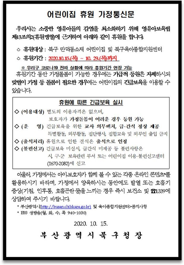 구는 추석연휴 전후로 만덕동에 ‘코로나19’ 확진자가 지속 발생하고 있어 해당지역에 대한 집합제한명령이 연장됨에 따라, 어린이집 및 학부모들의 의견을 반영하여 10월 15일부터 29일까지 전격 휴원 명령하기로 결정했다.