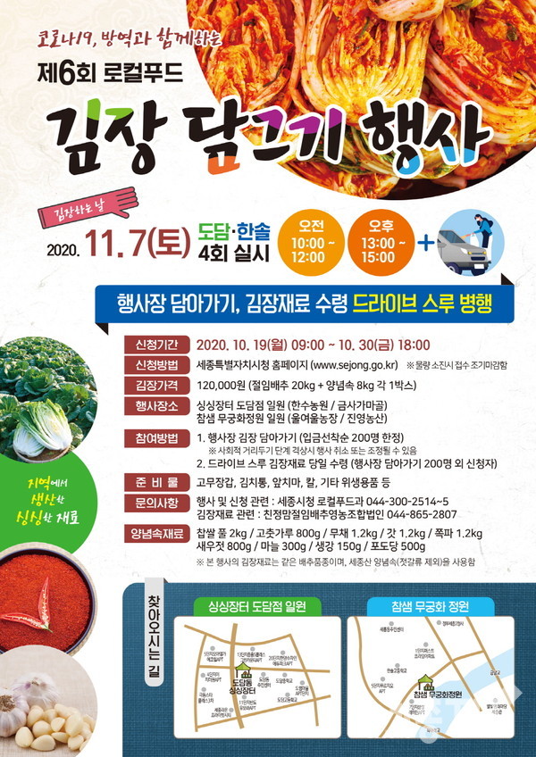참가신청은 시청 홈페이지(www.sejong.go.kr)를 통해 선착순 접수하면 되며, 보다 자세한 내용은 시청 홈페이지 등에 게시된 ‘제6회 로컬푸드 김장담그기 행사’ 안내문을 참고하면 된다.