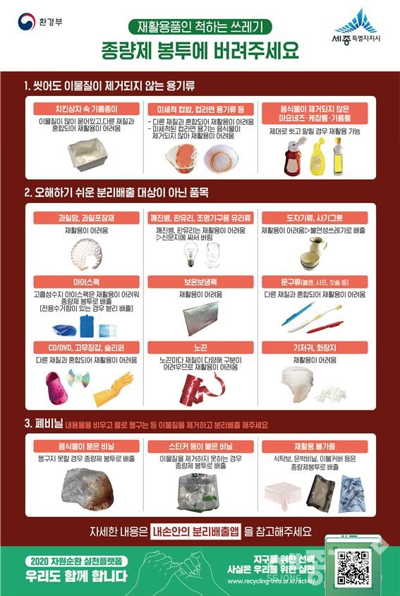 코로나 19에 따른 비대면 소비 증가로 재활용폐기물이 급속히 늘면서 세종특별자치시(시장 이춘희)가 시민들을 대상으로 올바른 생활쓰레기 분리배출 방법에 대한 대대적인 홍보에 나선다.
