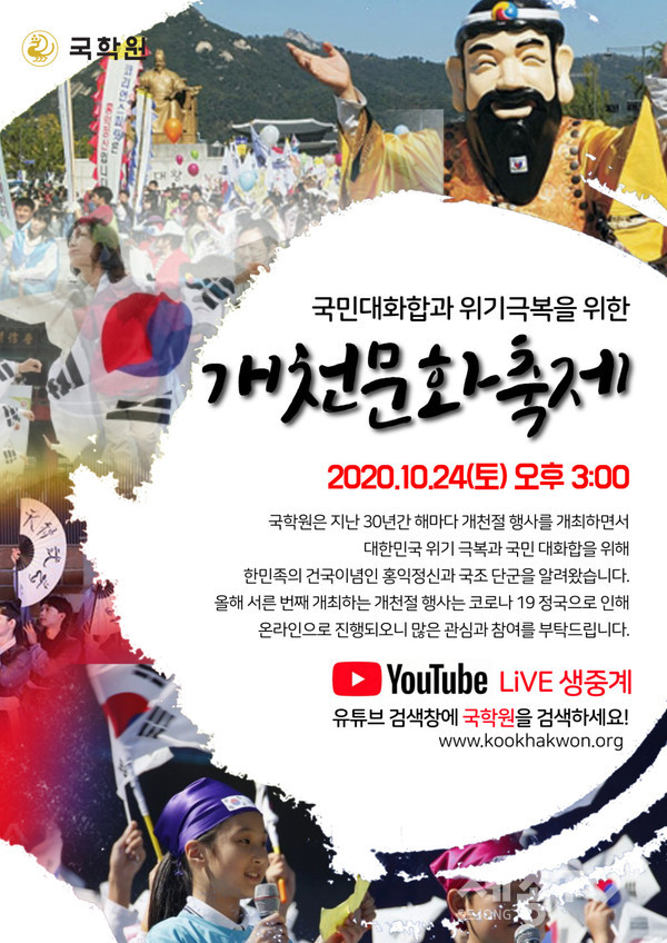 사단법인 국학원(원장 권나은)은 단기 4353년(서기 2020년) 개천절을 기념하여 국민 대화합과 위기 극복을 위한 개천 문화 대축제를 오는 10월 24일 오후 3시부터 4시까지 온라인으로 생중계한다.