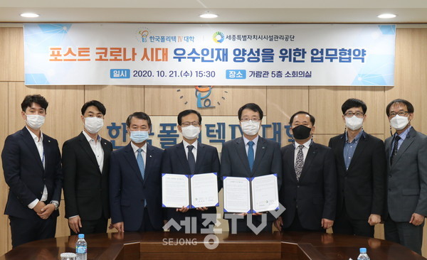 세종특별자치시시설관리공단(이사장 계용준)이 한국폴리텍대학 대전캠퍼스(학장 박봉순)와 지난 21일 포스트코로나 시대 우수인재 양성을 위한 업무협약을 체결했다고 밝혔다.