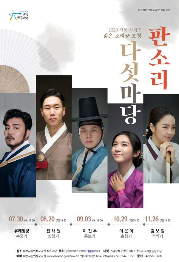 대전시립연정국악원(이하 국악원)과 TJB대전방송(이하 TJB)은 2020전통시리즈“젊은 소리꾼 초청, 판소리 다섯 마당”을 공동주최로 무대에 올린다.