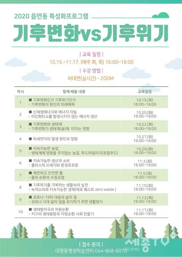 이에 대평동평생학습센터는 신규 프로그램으로 지난 15일 ‘기후변화vs기후위기과정’을 개설하고 내달 17일까지 매주 화·목요일 비대면 온라인 교육을 진행하고 있다.