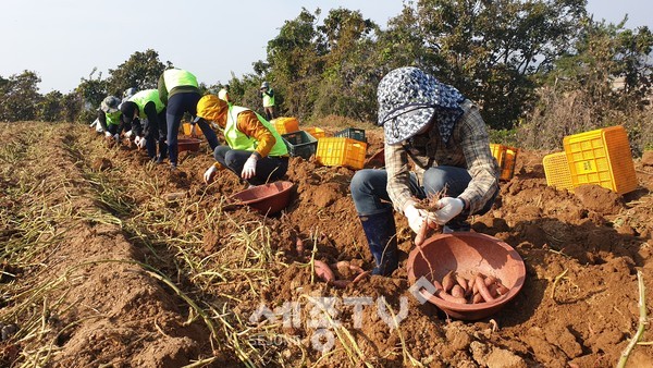 이에 농협 충남본부와 대호지농협(조합장 남우용) 임직원 및 대호지면 여성자원봉사자 40여명이 함께 농업인들에게 힘이 되고자 고구마 수확 현장 지원에 나섰다.