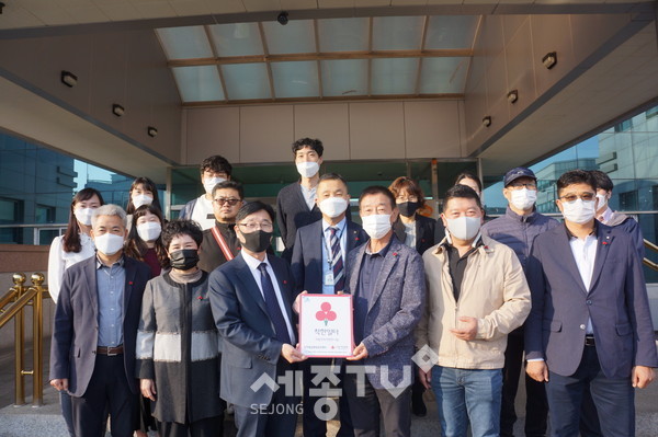세종특별자치시 조치원읍(읍장 임재공)이 26일 조치원읍행정복지센터에서 ‘착한일터 현판식’을 진행하고 착한 기부에 나서고 있다.