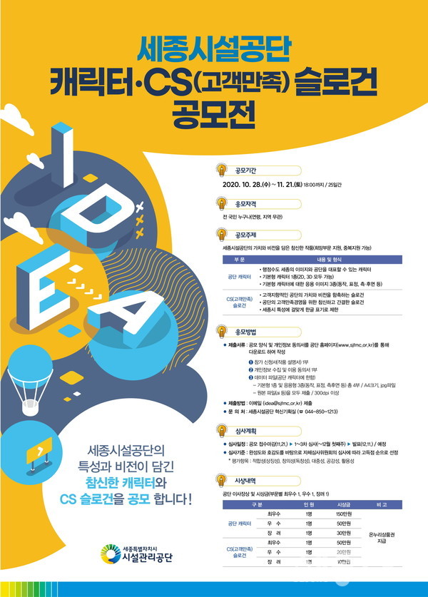 이번 공모전은 세종시의 특성을 반영한 공단을 상징하는 캐릭터와 고객만족경영을 위한 CS(고객만족)슬로건 두 개 부문을 대상으로 하며, 공모기간은 10월 28일부터 11월 21일까지로 공모전에 관심이 있는 사람이면 누구나 참여 가능하다.