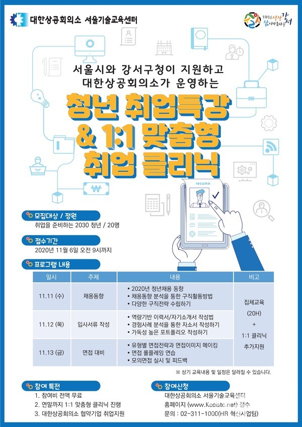 이에 대한 자세한 문의는 강서구청 일자리정책과(☎02-2600-6396) 또는 대한상공회의소 서울기술교육센터(☎02-311-1000)로 하면 된다.