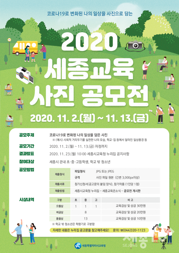 세종특별자치시교육청(교육감 최교진, 이하 세종시교육청)은 코로나19로 변화된 나의 일상을 주제로 ‘2020년도 세종교육 사진 공모전’을 개최한다.