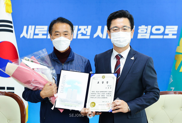 대전시는 2일 오전 11시 시청 응접실에서 지난 9월 29일 대전 대사동 화재 시 시민을 구한 CMB AS 기사 오성균 씨(사진 왼쪽)에게 대전시장 표창을 수여했다.