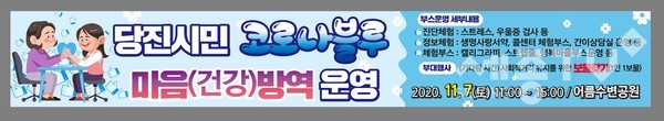 당진시는 코로나블루로 지쳐있는 시민들을 위해 가을단풍 속에서 마음건강을 체크하는 ‘코로나블루 마음방역 프로그램’을 오는 7일 대덕동 어름수변공원에서 오전 11시부터 오후 3시까지 4시간 동안 진행한다.