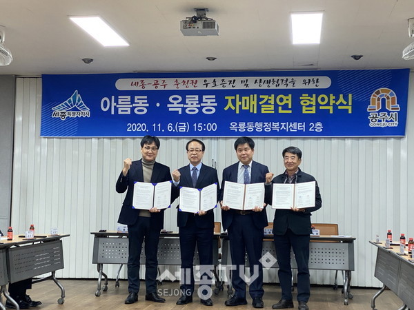 세종시 아름동(동장 여상수)과 공주시 옥룡동(동장 이창원)이 6일 공주 옥룡동행정복지센터에서 세종-공주 충청지역 상생협력을 위해 자매결연을 체결했다.