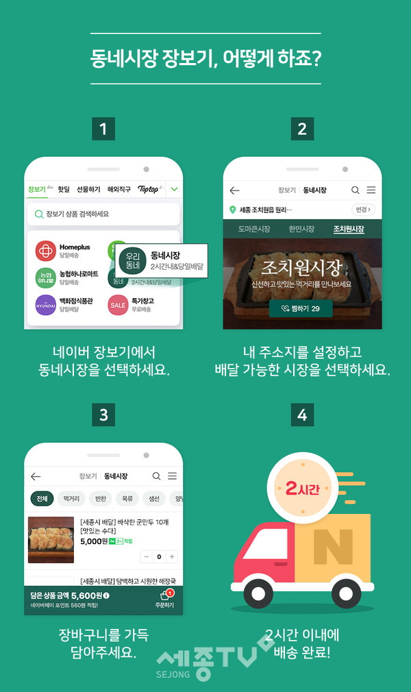 주문 방법은 소비자가 PC 또는 휴대전화로 네이버의 ‘동네시장 장보기’나 ‘조치원시장’ 플랫폼에 접속한 뒤 구매품을 선택한 후 신용카드·네이버페이 등으로 결제하면 된다.