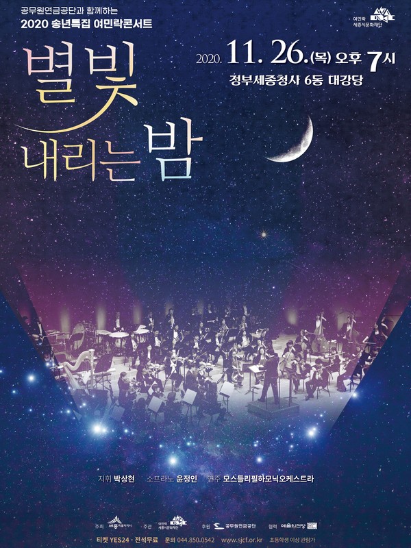 이번 공연은 올 한해 코로나19 대응으로 수고하고 애쓴 공무원과 공무원 가족, 세종시민들을 격려하기 위해 마련된 것으로 공무원연금공단(이사장 정남준)의 후원으로 진행된다.